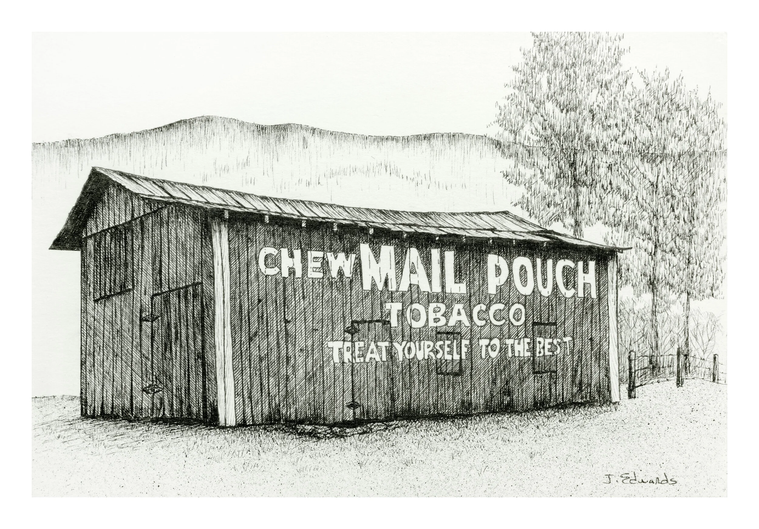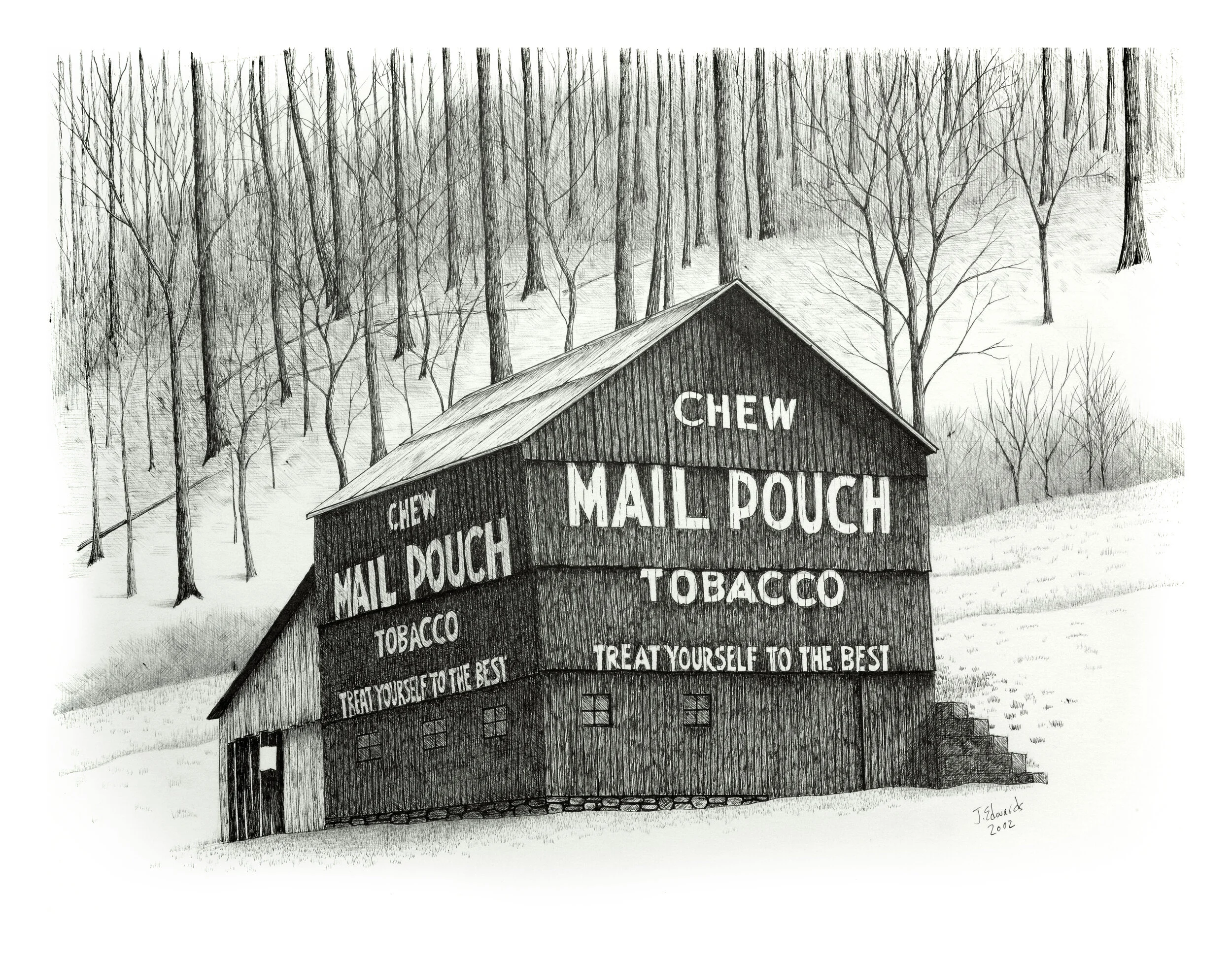 Mail Pouch Barns were quite common in West Virginia and several nearby states. Much like “Rock City Barns”, a travelling painter would offer to paint a barn that could be seen from the road in exchange for the advertising; much like a billboard. For many years this advertising means was very common in the mountains. I have drawn several mail pouch and rock city barns, but this one has a bit of a story. I drew if from a photo someone had given me and like many other drawings, I threw this one on the pile of finished works. Sometimes later, my friend Steve sent me a photo via email suggesting I draw it. I sent him back the finished image in a few minutes with the question “Is that fast enough for ya?”. So this one should probably be the “Is that fast enough Mail Pouch Barn”.